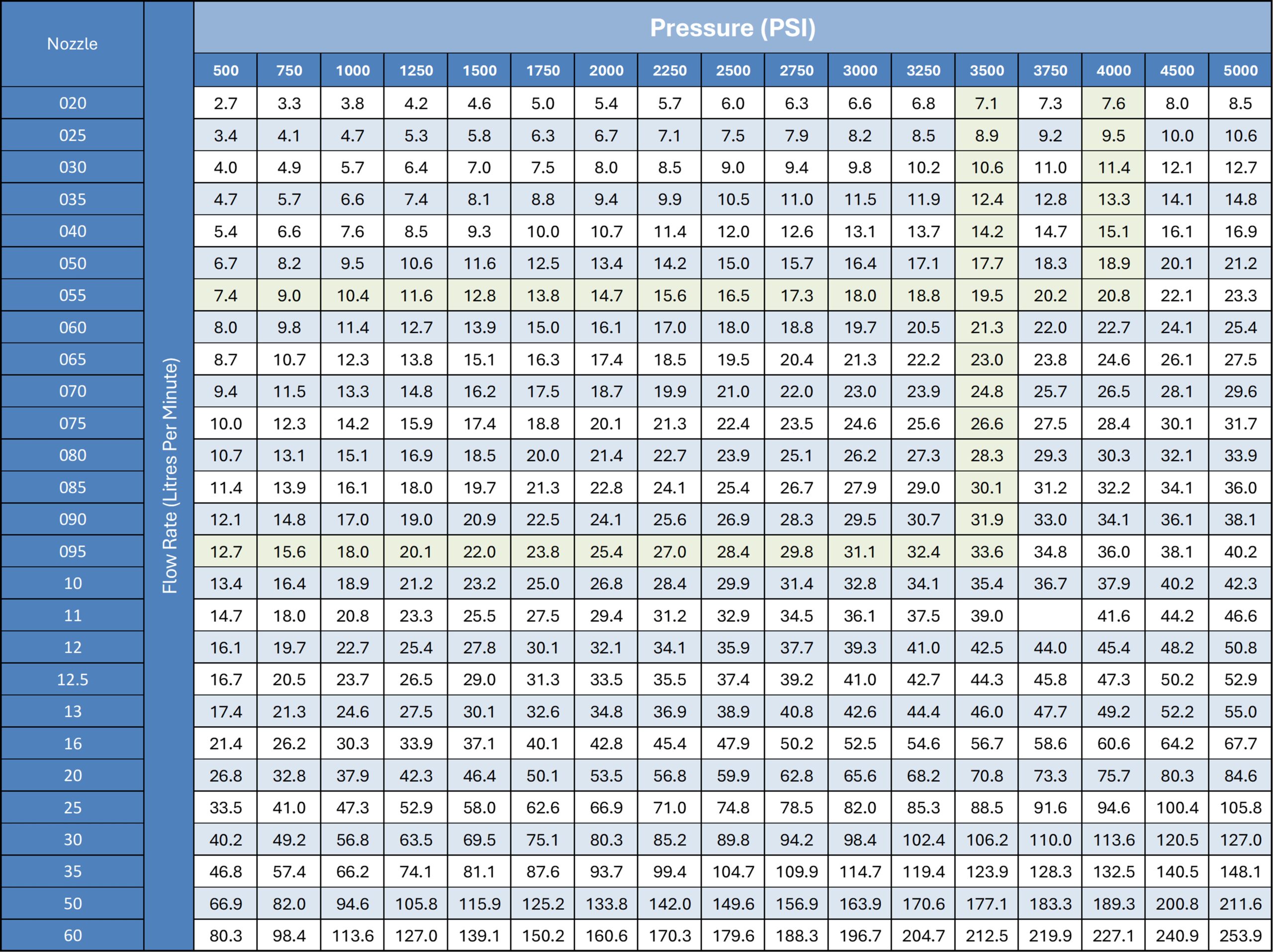 Pressure cleaner Tip Chart.